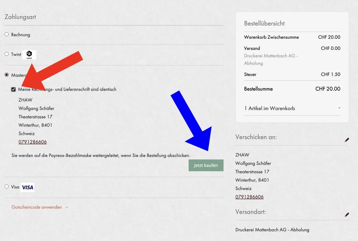 Now, choose Mastercard or Visa as your payment option (Not “Rechnung” (invoice) as the payment by invoice would take too loong and, thus, won’t work for this special offer). Make sure to have the check box checked to the left of “Meine Rechnungs- und Lieferanschrift sind identisch” ("=My billing and delivery addresses are the same”, see red arrow). To proceed to the payment process, finally click on “Jetzt kaufen” (“buy now”, see blue arrow).