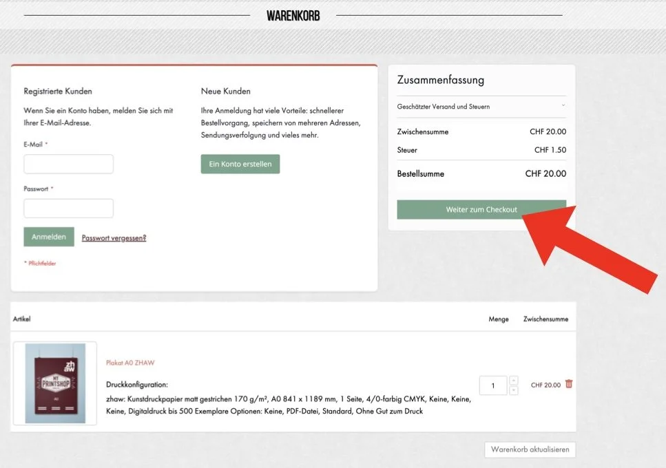 (4) Now, you don’t have to create a new customer account but can directly go to the checkout by clicking on the button “Weiter zum Checkout” (see red arrow).